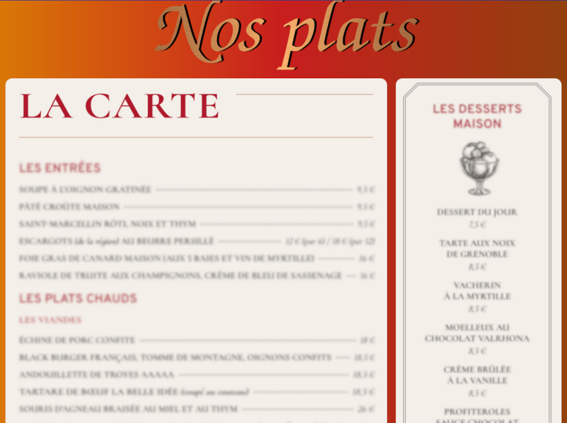 Vous trouverez sur notre carte de grands classiques de la gastronomie française :